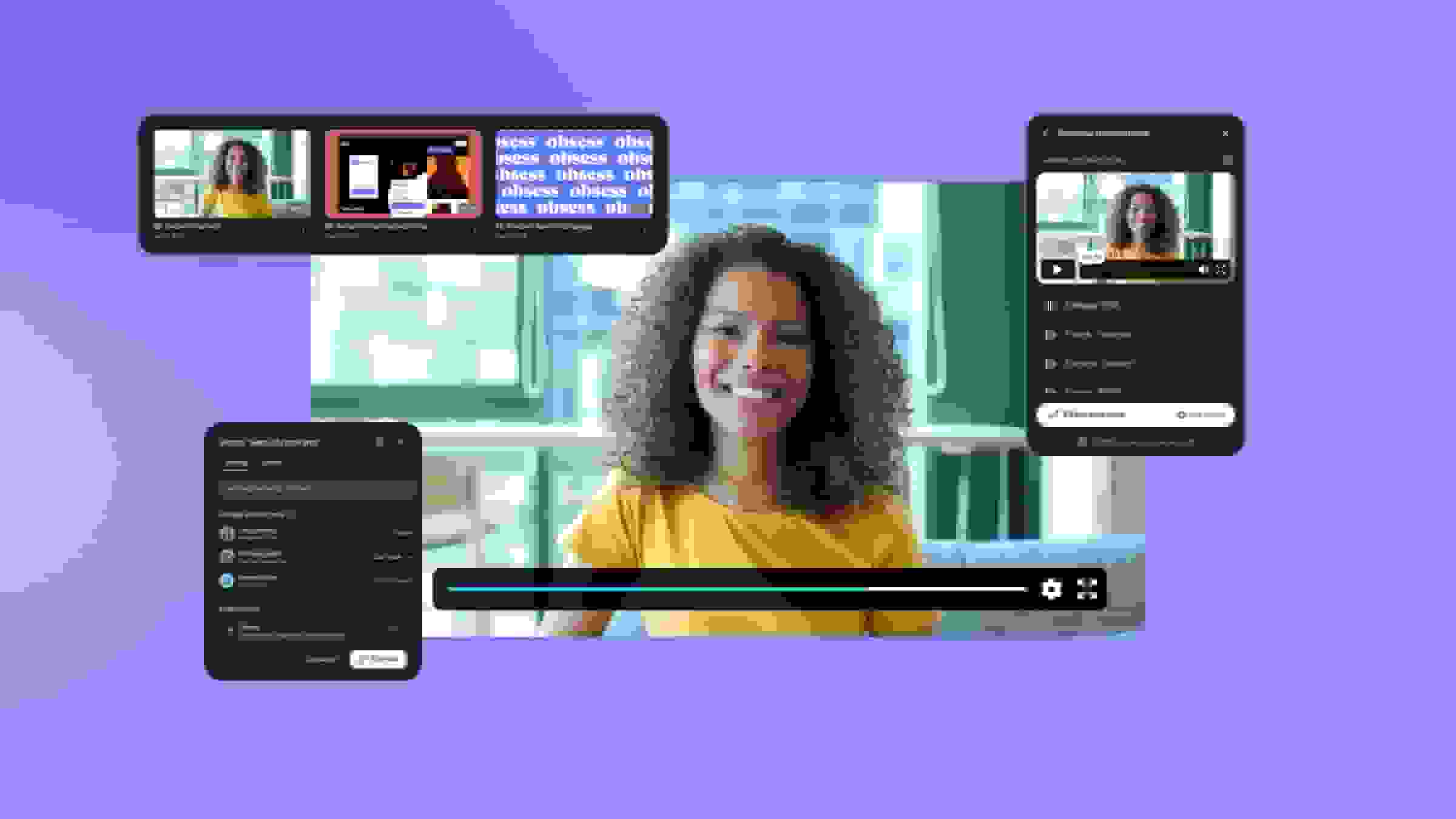 AI tools | Text-based editor that removes filler words Video trimmer AI video summary Auto caption Video highlights Ask a question Library search Search by caption Auto-generated video titles summaries and chapters | Automatic transcription and summaries with suggested action items Auto caption Speaker identification Auto-generated chapters Live translations Generative AI in Teams chat Search emails, chats, documents, and web And more (Some features require a Microsoft 365 Copilot license) | Highlights and smart chapters Meeting summaries AI-generated virtual backgrounds Email compose Chat compose AI image generation AI translations and more | Automated meeting and messaging summaries (Vidcast) Automatic chapter generation AI video translation Background noise removal Voice optimization Transcription Closed captions AI Audio Codec and Super Resolution using AI | Real-time translation AI user-controlled chat Multi-language dubbing Highlighting and chaptering AI-powered content curation |