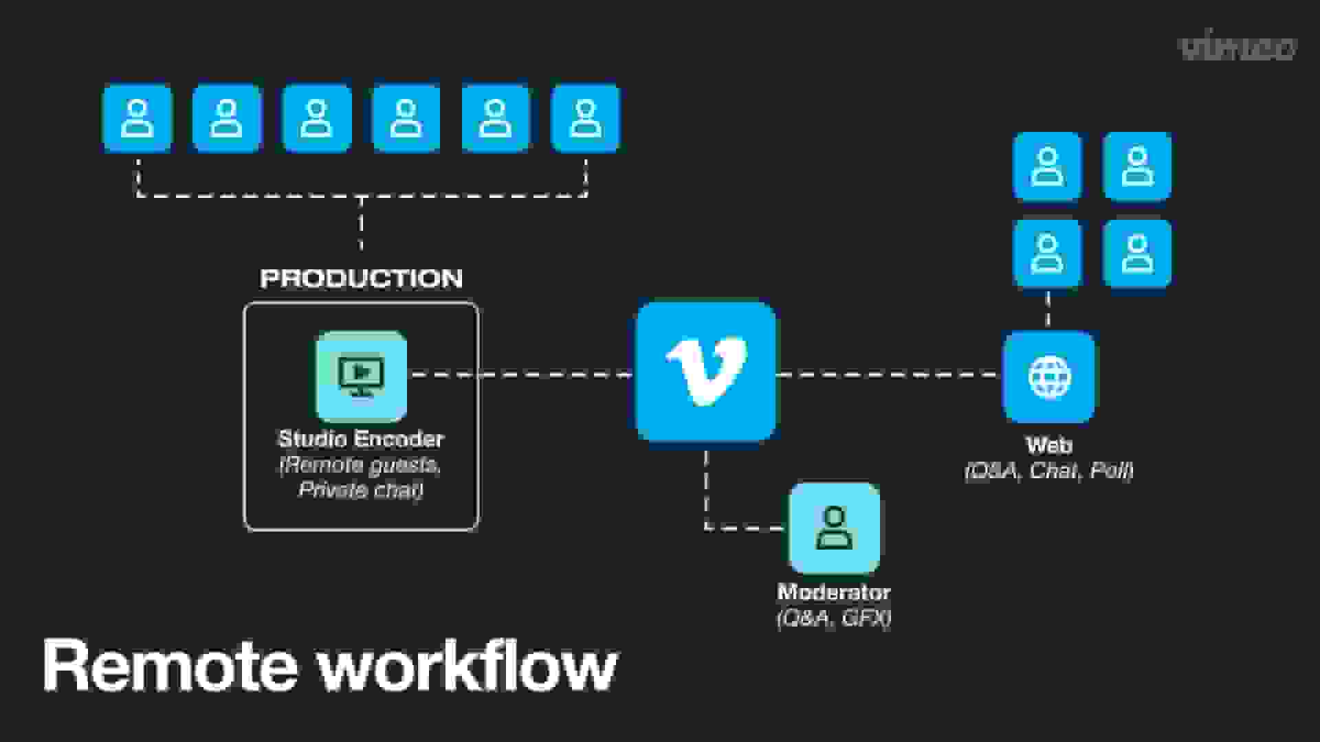 Remote productions happen when the audience and speakers are tuning in remotely and a production team only has access to the live streaming platform and encoder. Remote productions include virtual events and internal meetings like all hands meetings or a virtual SKO.