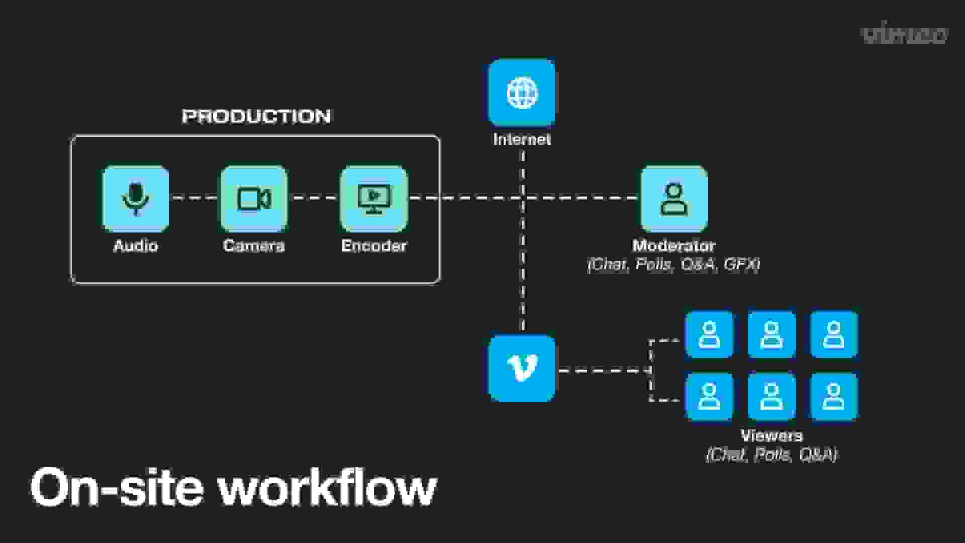An on-site production workflow can range in scope depending on your content, but you will typically find cameras, audio, lighting, and an encoder. Combined with a strong, stable internet and you’re well-equipped to go live.