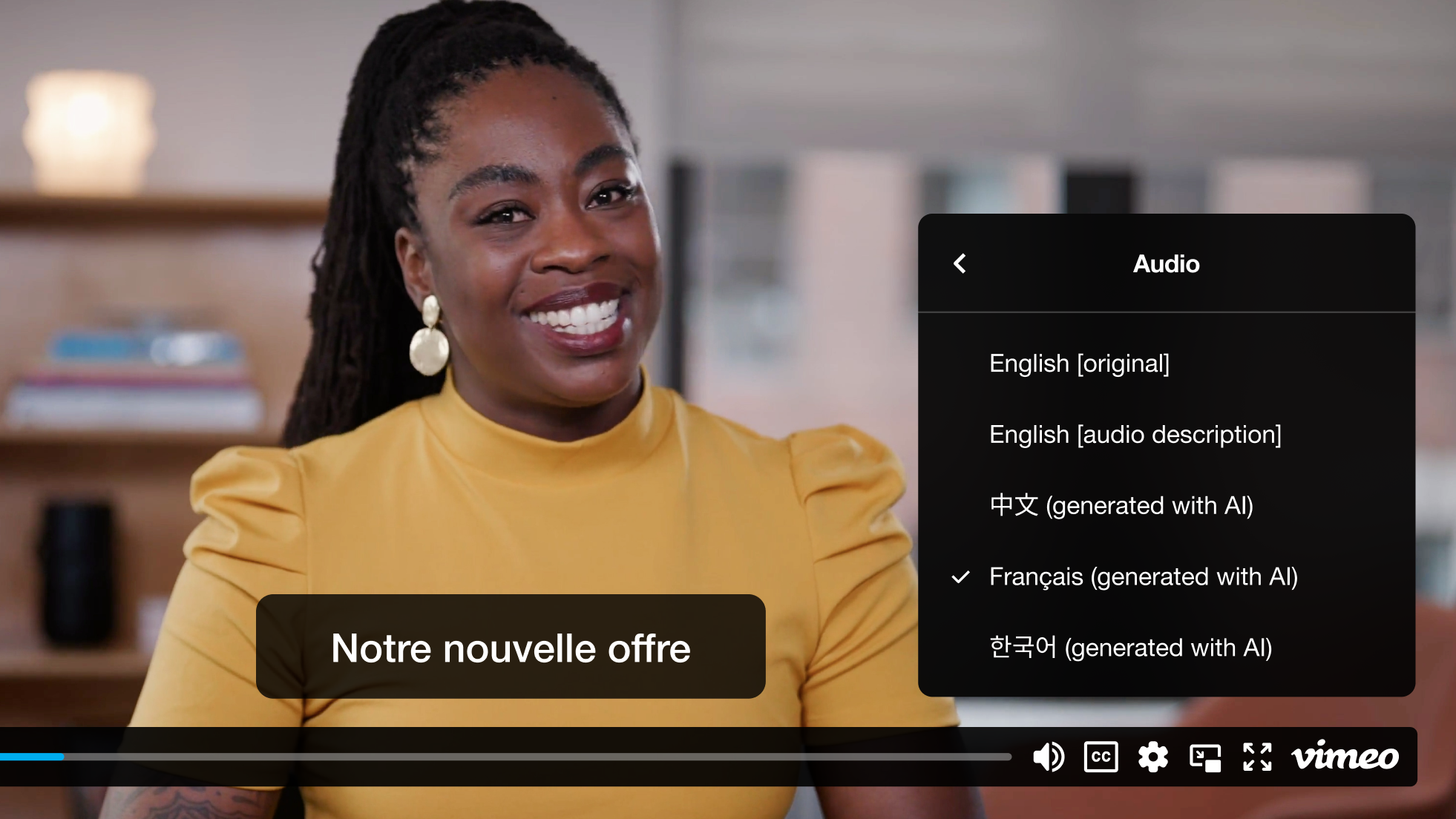 Vimeo AI translations can help expand your global audience by instantly translating the subtitles (and audio) of your videos into dozens of languages!