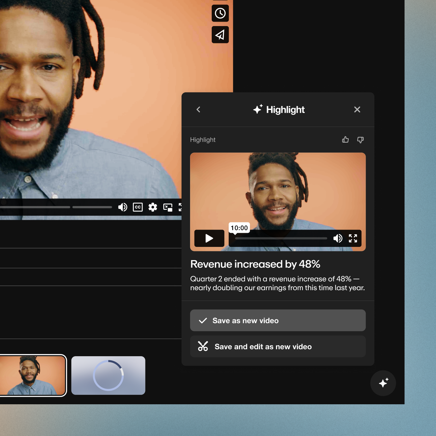 Tirez parti de l'IA Vimeo pour créer des temps forts ou des résumés textuels, modifier des clips, ajouter des chapitres et plus encore. Convertissez les résultats des sondages interactifs en informations pour les événements futurs, le contenu des blogs ou même le développement de produits.